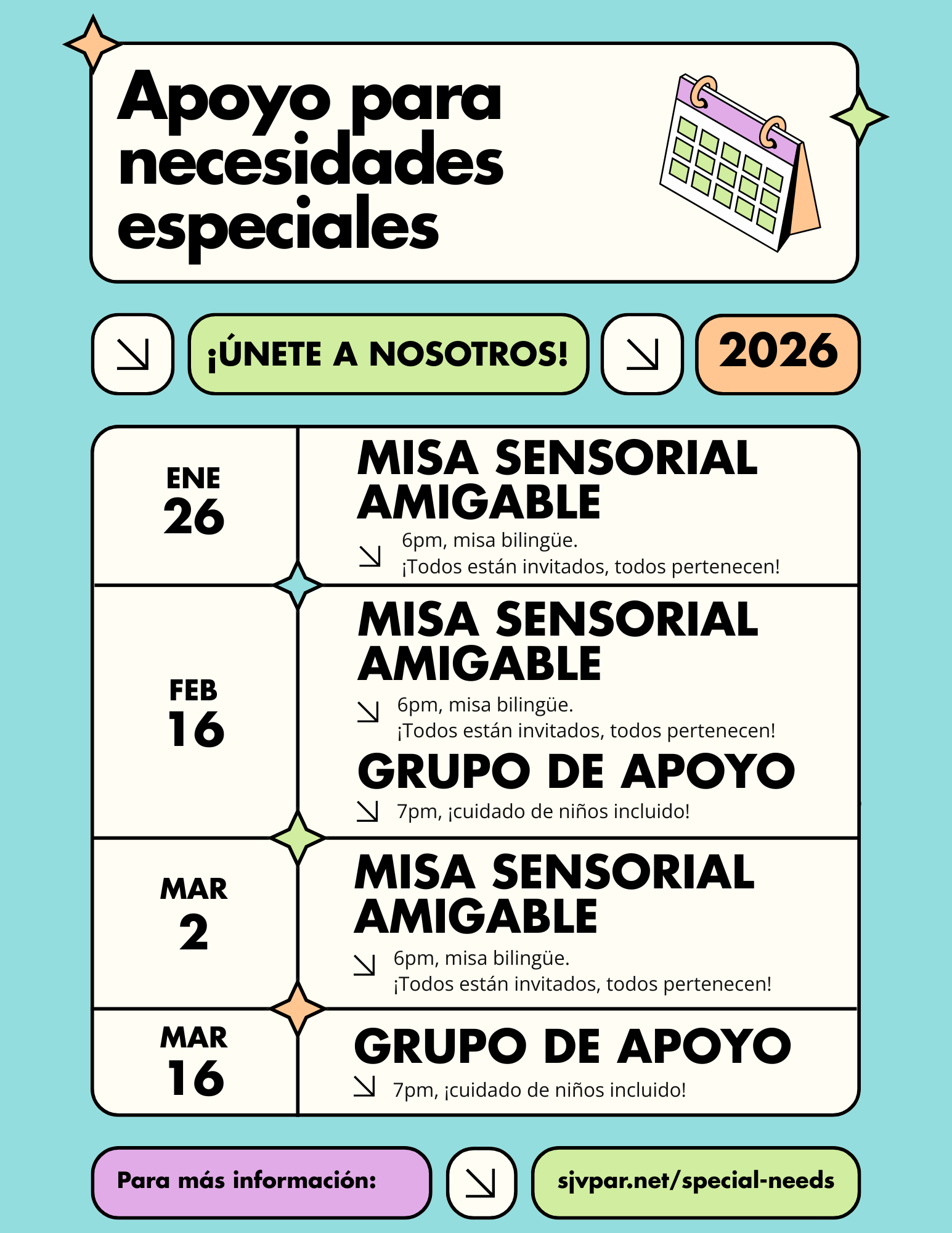 Nuestro Grupo de Apoyo para Necesidades Especiales es un ministerio nuevo y en crecimiento en la Iglesia Católica de St. John Vianney. En nuestras reuniones, participan diversas personas y familias que aman y cuidan a alguien con necesidades especiales. Ofrecemos información y apoyo a familias y padres mientras se proporciona cuidado infantil. Nuestras reuniones son bilingües (inglés y español) y abarcan diversos temas útiles. Entre los temas que hemos abordado se incluyen: cuidado después de la secundaria, PEI, personas recién diagnosticadas, apoyo del sistema escolar, testamentos y fideicomisos, y misa con niños con necesidades especiales. Normalmente, proponemos un tema para comenzar nuestras reuniones y luego, a continuación, una sesión de preguntas y respuestas con el presentador profesional que se programa esa noche.